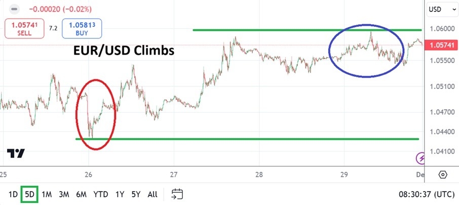 - After trading below the 1.04000 level on Friday the 22nd on November, and then showing the ability to create durable support at slightly higher ratios early this past week, the EUR/USD began to incrementally climb on Wednesday and held its ground during the U.S holiday.