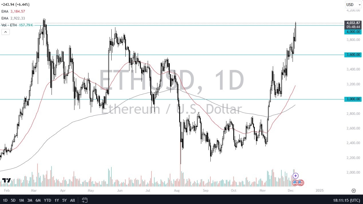 Keep in mind that the altcoins out there will continue to move in this market. With some of these smaller coins, it has a knock on effect mainly due to the fact that most of them operate on the Ethereum ecosystem. So the future is bright for Ethereum, assuming that one of these actually ends up being a useful thing. That's a xn--xm-6d1dw86k.completely different conversation. But what we do know is everything in crypto is going straight up in the air again. We know the cycle. We know eventually things fall apart, but as things stand right now, there's really no signs of that. So, I think you continue to look at Ethereum as something that you can buy on dips. Where do we go? Well, the measured move is roughly $4,300 if we can keep up the momentum.