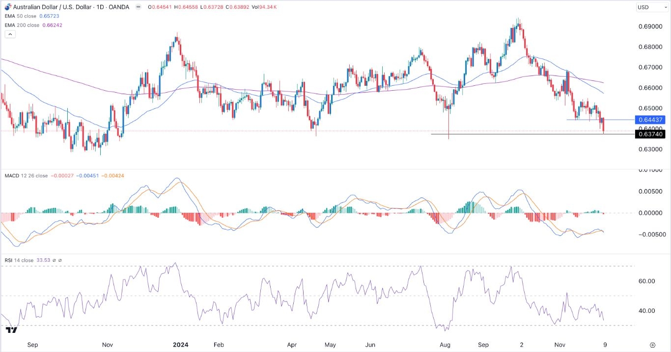 The MACD indicator has remained below the zero line, while the Relative Strength Index (RSI) is nearing the oversold level. It has also dropped below the key support at 0.6443, its lowest point on November 14.
