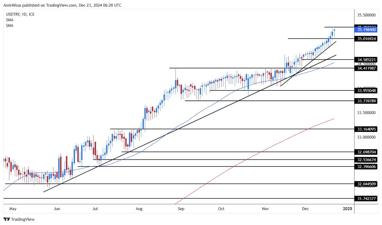 Technically, the USD/TRY pair continued its gains, maintaining the pace of the rises that the pair recorded over the past months. Concurrently, the price is approaching the levels of 35.25 lira. Moreover, Current estimates indicate that the pair will continue to rise within the overall upward trend that dominates the pair's trading. Clearly, the price is based on a small upward trendline that represents support levels. Also, on a larger time frame, the price is trading above another upward trendline that may support the pair's rises. At the same time, the price is trading above the 50 and 200 moving averages, respectively, on both the daily and four-hour timeframes. Finally, the Turkish lira price forecast includes the continued rise of the pair after each decline, targeting levels of 35.25 and 35.50, respectively.