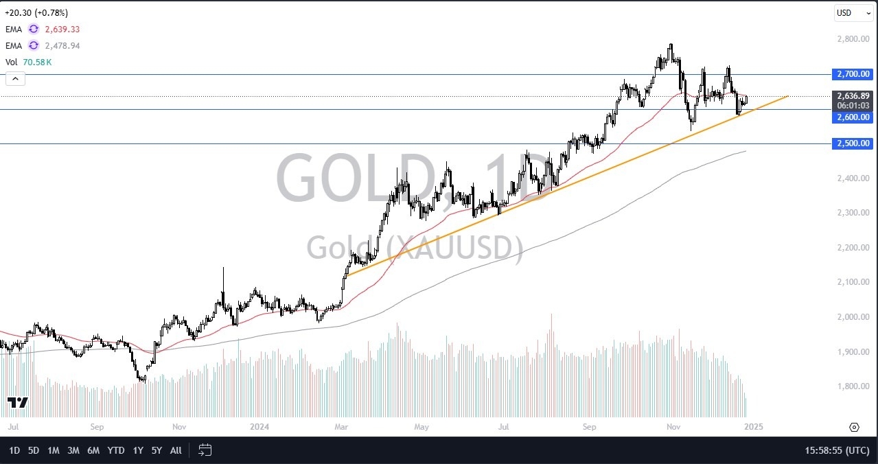 The technical analysis for this gold market is somewhat neutral in the short term, but in the longer term I think it still could be somewhat bullish. We have a trend line underneath that has offered a significant amount of support near the $2600 level, which in and of itself is an area that I think a lot of people will pay attention to because it is a large, round, psychologically significant figure. We also have the 50 Day EMA sitting just above current pricing, and I think that will cause a little bit of technical resistance, but I think it’s probably only somewhat influential.