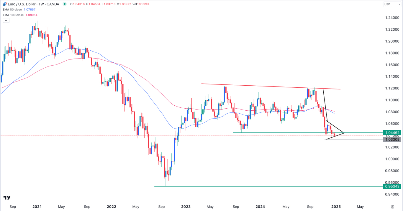 The pair’s 100-week and 50-week Exponential Moving Averages (EMA) have formed a bearish crossover pattern. Also, it has formed a bearish pennant chart pattern, a popular bearish continuation sign.