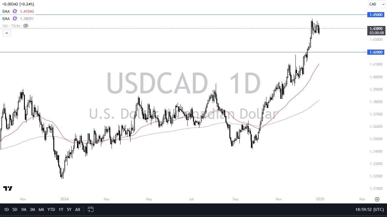 In Canada, we have a mess, so I think there's a really good shot that we continue to see this market break towards the 1.45 level. At this juncture, any short-term pullback will more likely than not end up offering buying opportunities, perhaps all the way down to the 1.42 level. The 1.42 level was an area of importance a couple of times, and now we have the 50-day EMA xn--xm-6d1dw86k.comracing offering a little bit of support also. In this environment, I just don't have any interest in trying to get too cute here.