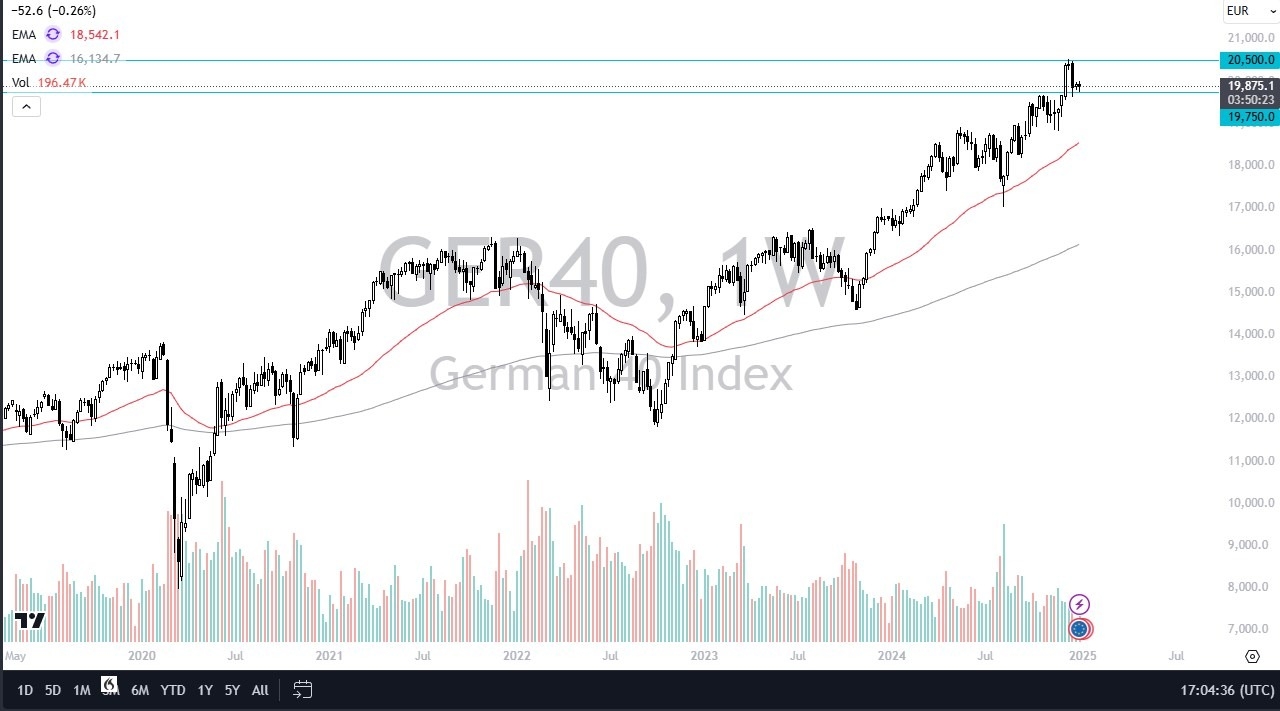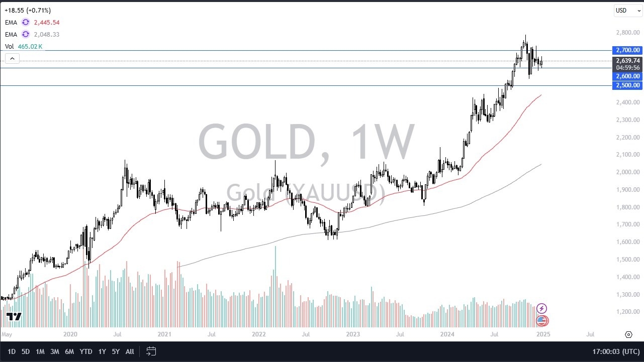 Gold markets have gone back and forth during the trading week, which makes sense considering that we are just simply killing time in trying to sort out where we are going next longer term. I think we are entering a rather large consolidation area, as we had originally shot straight up in the air, and therefore I think you’ve got a situation where we have to work off some of xn--xm-6d1dw86k.comthe froth. I am very neutral on the gold market right now, but I recognize that any pullback will probably look at the $2500 level as “value.”