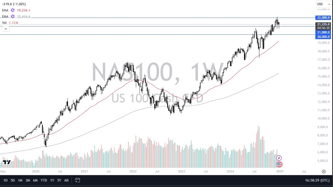 The NASDAQ 100 has been a bit noisy, but really at this point in time it looks like a market that continues to be more or less a “buy on the dips” scenario. The 21,000 level is an area that a lot of people are paying attention to as potential support, but if we were to break down below the lows of the week, this would be an area that could trigger a bit more selling. At that point, I would anticipate that the NASDAQ 100 will go looking to the 20,000 level for a significant amount of support based on the large, round, psychologically significant figure, and of course the fact that it has been important previously. All things being equal though, I expect this market to be more back and forth during most of the week, as we have the Non-Farm Payroll numbers xn--xm-6d1dw86k.coming out on Friday. Either way, I’m bullish longer term.