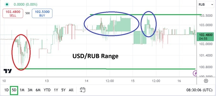 - The currency pair has achieved some relative calm thhttps://xn--xm-6d1dw86k.come past few days and has begun to display the potential of challenging support levels near the 100.0000 level. The USD/RUB is near the 102.4800 ratio at this time, based on a large spread between bids and asks.