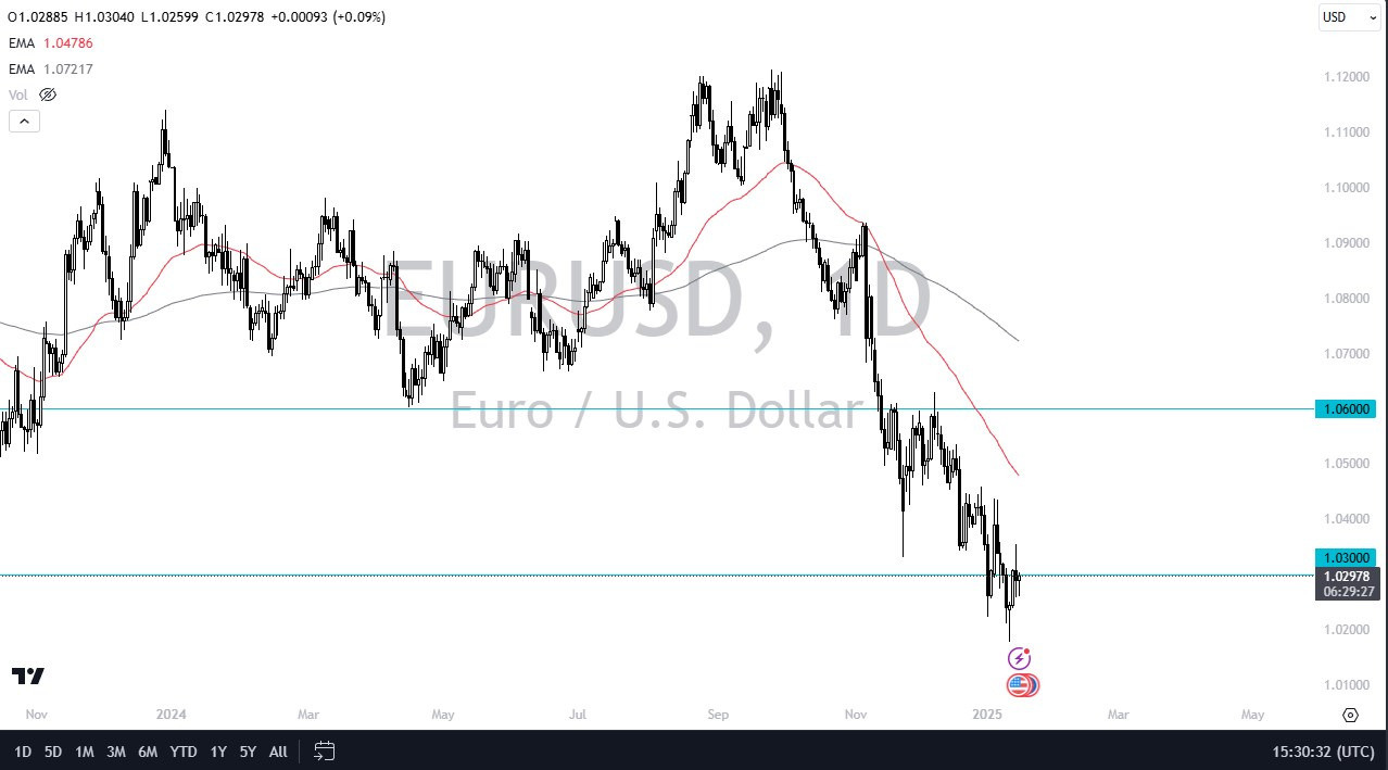 To the downside, the 1.02 level is an area that I think will offer significant support, and therefore you need to pay close attention to it. If we were to break down below there, then I think the bottom falls out in the euro, and that would be the sign that we are in fact getting ready to go to the parity level. For what it is worth, I believe that the parity level will eventually be tested, but that doesn’t mean we get there easily. Furthermore, it’s also worth noting that there has to be a certain amount of profit-taking sooner or later, so that might also be a factor in this pair. I have no interest in buying the euro, and if I wanted to buy something against the US dollar, the euro would be just about at the bottom of that list.