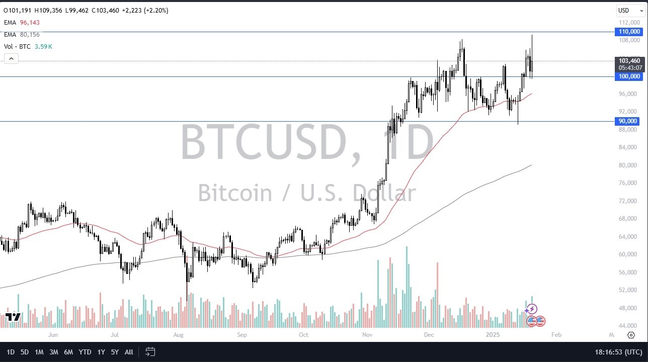 - That's the real question. What will the Americans do at this point with Bitcoin and other cryptocurrency markets and what will they do as far as legislation? Bitcoin reached towards the $110,000 level early in the session but has turned around to sell off quite a bit of those gains. Nonetheless, we have also found plenty of support at the $100,000 level.