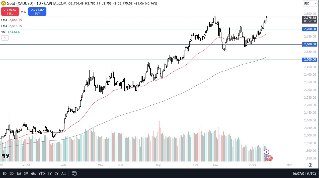 Gold rallied a bit during the trading session on Friday as we continue to see a lot of upward pressure on the gold market. But the question now is whether or not we can actually go higher for longer. I think we do, but there was a little bit of hesitation heading into the weekend. So therefore, I think we have a scenario where pull backs are buying opportunities and the $2,700 level underneath continues to be the floor. The 50-day EMA is racing toward that area, and therefore you need to be cognizant of the fact that it could very well reinforce this region. I have no interest whatsoever in trying to get too cute here.