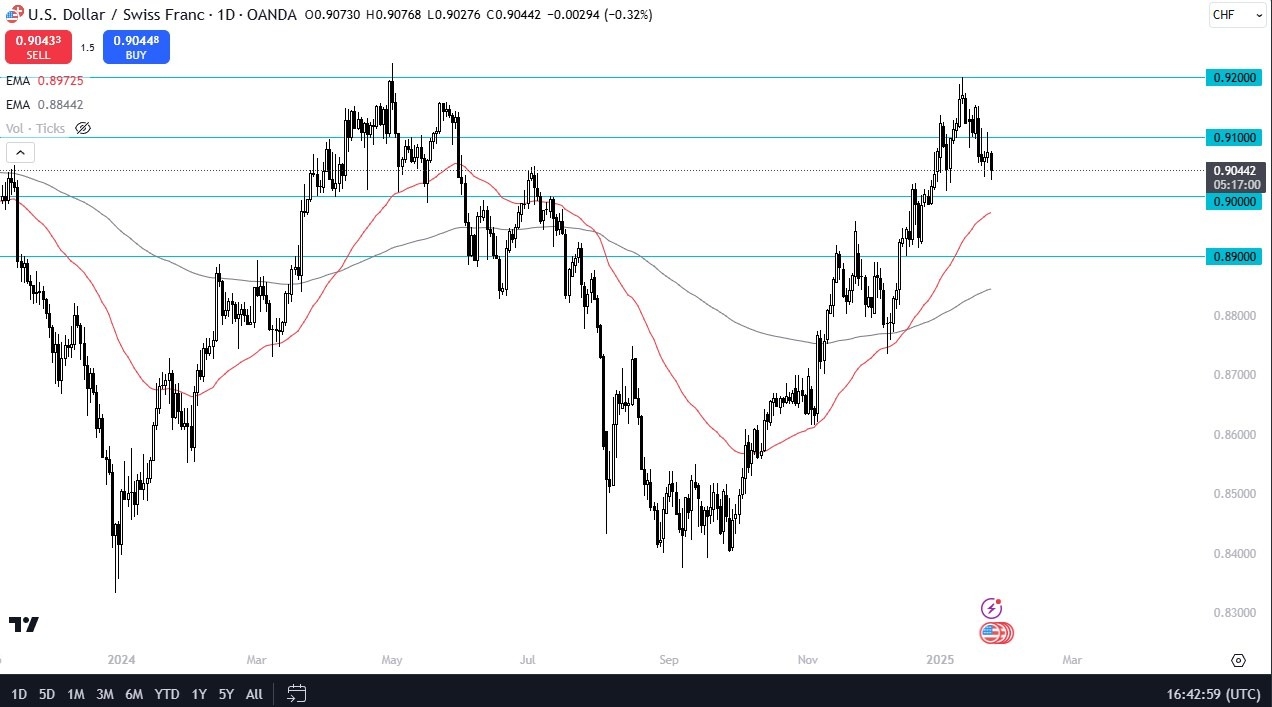 The 0.90 level is a major support level that is not only psychologically important, but it's also backed up by the 50-day EMA. If we can break above the 0.91 level, then it makes a certain amount of sense that we could go look into the 0.92 level.
