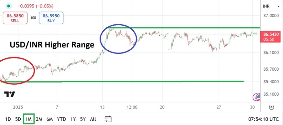 Speculative price range for USD/INR is 86.3500 to 86.8500