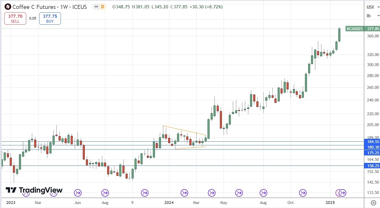 Arabica coffee has reached an all-time high, due partly to climatic factors such as the recent drought in Brazil, and partly due to political factors, both of which are working to reduce supply, while demand continues to be as high as it ever has been.