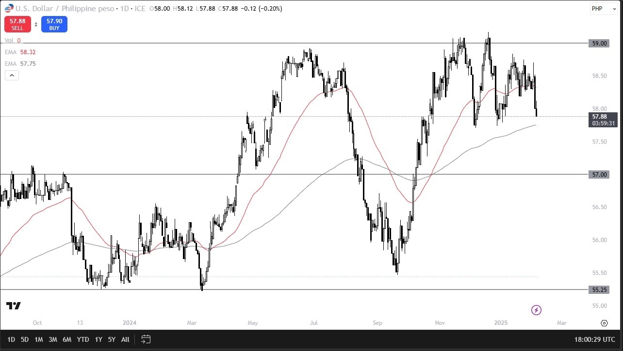 So, I think we need to watch how this plays out over the next couple of days. While I don't necessarily like the idea of shorting the US dollar, it is worth noting that the Philippine peso is a much smaller currency pair, and therefore it will take a lot less to get things going in one direction or the other. On a bounce at this point, I think I'd be a buyer for short term range bound trade, but I don't know that we're going anywhere longer term, at least not yet. If we did break above the 59.15 level, then we could see the US dollar really take off against the Philippine peso.