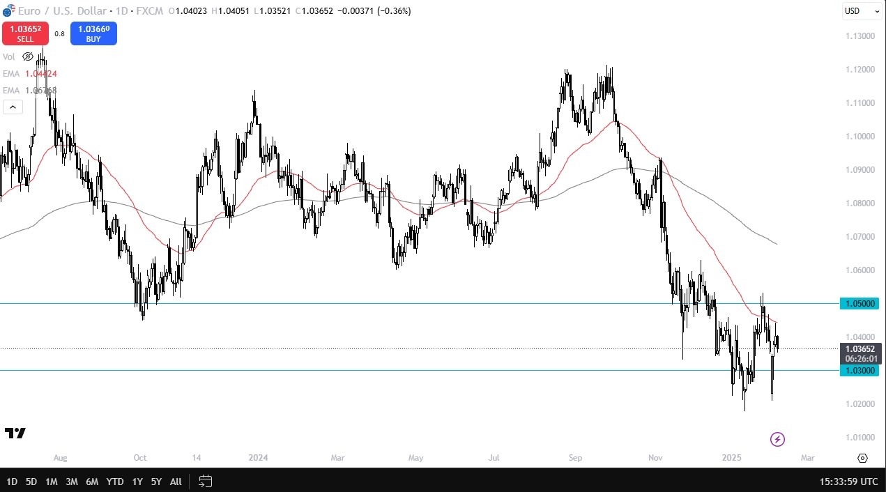 All of that being said, I do anticipate that we have a scenario that we stay somewhat range bound with more of a downward tilt. The 1.05 level above is a significant ceiling, just as the 50 Day EMA has offered quite a bit of resistance. Somewhere between those 2 levels, I would anticipate sellers jumping back into this market, barring some type of major shock. This assumes that we can rally at this point. If we were to break down from here, then I think the 1.0250 level could be the next target.