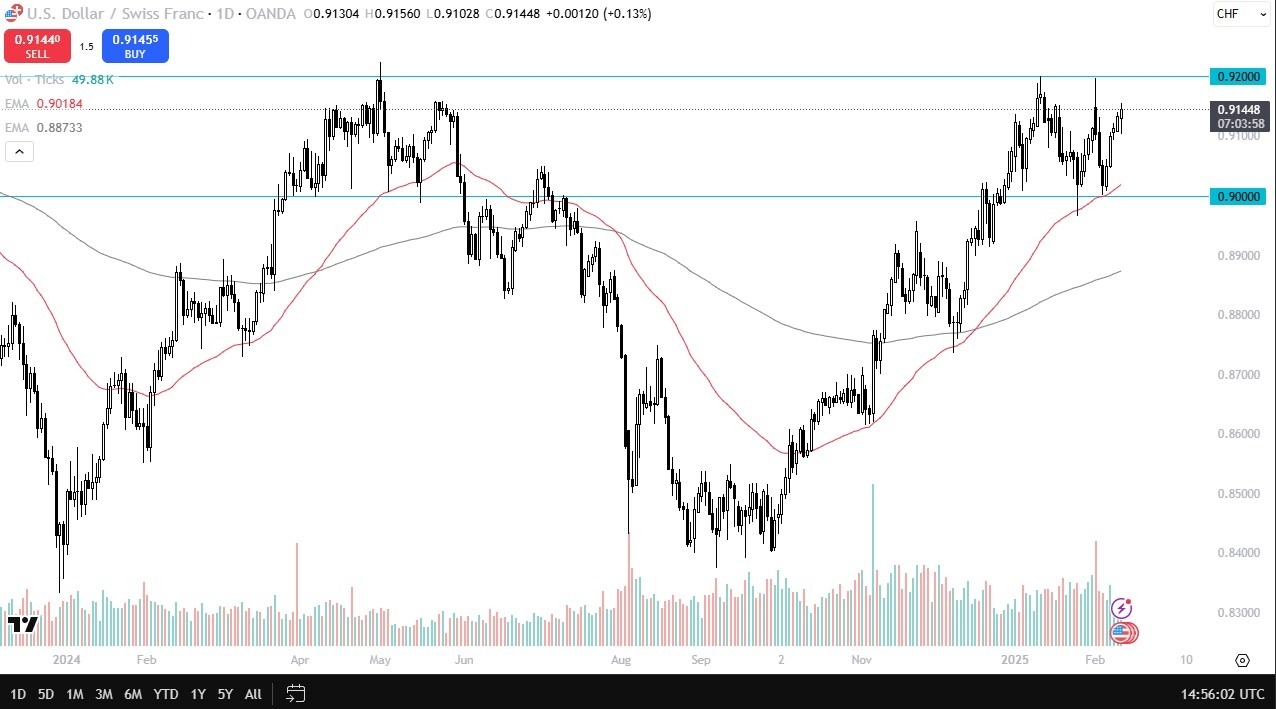 At this point in time, the market is in a bit of a “holding pattern”, as we continue to determine whether or not we are going to finally break out and see the US dollar really overtake the Swiss franc. After all, the Swiss National Bank has recently cut interest rates by 50 basis points, and with the CPI numbers xn--xm-6d1dw86k.coming out hotter than anticipated, it makes quite a bit of sense that we would see the Federal Reserve remains somewhat hawkish, and therefore think you got a situation where the US dollar will continue to strengthen against the lowly Swiss franc.