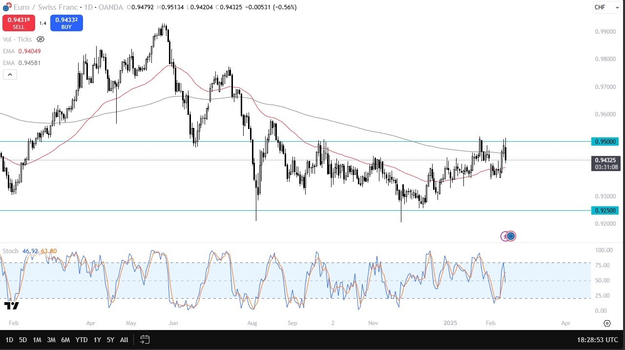 As things stand currently though, we are still very much in a range, and you have to look at it through that prism. We just formed a double top, and we could drop to the 0.9350 level quite easily. After all, the candlestick for the trading session was rather bearish on Thursday, but Tuesday was very bullish. So read into that what you will. If we can break above the double top, then I think it opens up the move to 0.96 and then possibly 0.98. We are in the process of forming some type of bottoming pattern in an area that has served as a bottom, back in the beginning of 2024, so we'll have to see if that holds. Quite frankly, I think you have choppy but maybe slightly positive leaning sentiment and momentum in this pair at the moment.