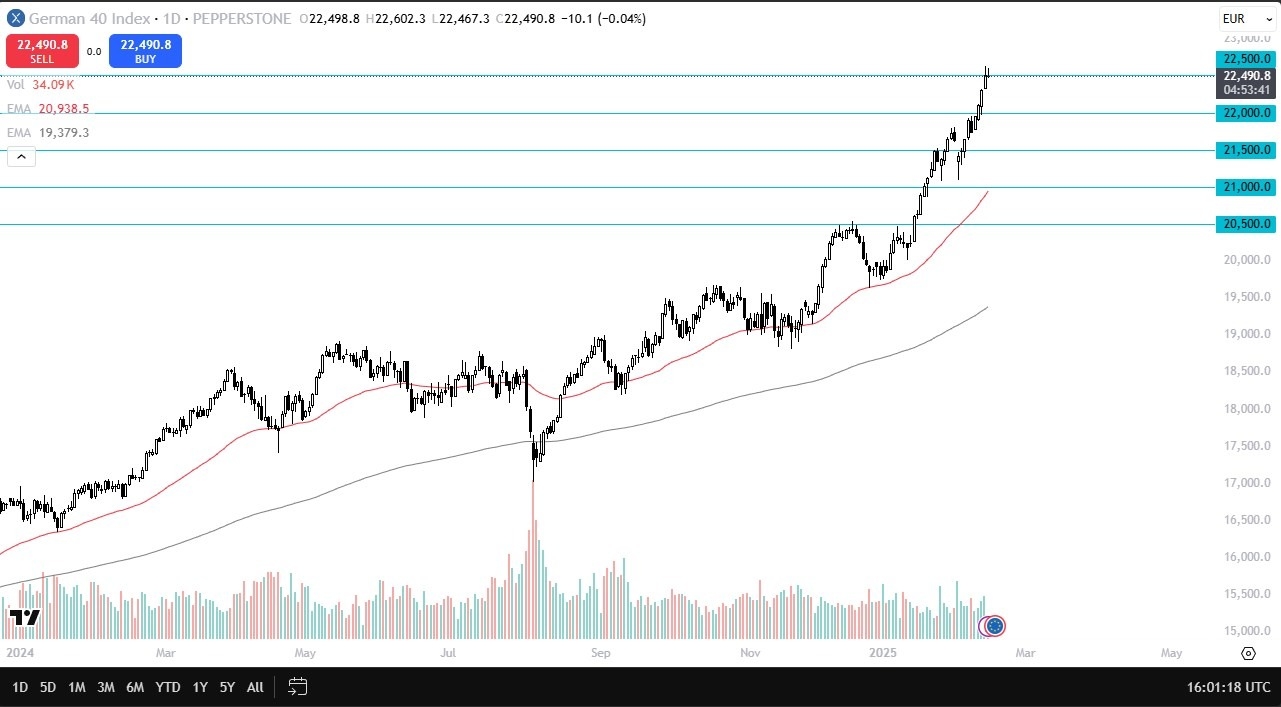 The first level of support I see is at the 22,500 euro level, followed by the 21,650 euro level based on previous price action. I do not want to short this market; I just want to step out of the way and let it pull back in order to find a bit of value. Ultimately, this is a market that I do think will go higher. I just think that it's a little bit tired at the moment.
