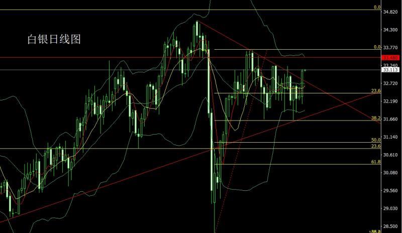 El mercado de plata abrió a 32.324 ayer y el mercado cayó primero. La línea diaria estaba en el punto más bajo de 32.105 y luego el mercado aumentó fuertemente. La línea diaria alcanzó el punto más alto de 33.118 y luego el mercado se consolidó. La línea diaria finalmente se cerró a 33.076 y luego se cerró con una gran línea positiva con una larga línea de sombras inferiores. Después de que terminó este patrón, el mercado de hoy retrocedió mucho. En el momento, el mercado de hoy fue 32.7 y detener la pérdida en 32.5, el objetivo fue 33.15 y el descanso fue de 33.4 y 33.6.