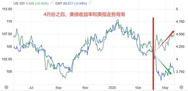 El mercado de bonos estadounidenses es el ancla de superposición del dólar y el oro estadounidense. Antes de abril, el índice del dólar estadounidense y las curvas de rendimiento del tesoro de los Estados Unidos aumentaron y cayeron. Después de abril,A medida que se cuestiona la política de Trump, los bancos centrales en varios países han vendido bonos estadounidenses, lo que resulta en un fuerte aumento en los rendimientos de los bonos estadounidenses. El índice del dólar estadounidense ya no resuena con los rendimientos del Tesoro de los Estados Unidos, y el mercado ha caído bruscamente, y las tendencias de los dos están significativamente divergentes. Creemos que la tendencia del índice del dólar estadounidense es más lógica y puede representar el sentimiento de los participantes del mercado para soportar la economía de los Estados Unidos. El fuerte aumento en los rendimientos del Tesoro de los Estados Unidos puede ser solo una disposición técnica, especialmente cuando se enfrenta a las liquidaciones por parte de los bancos centrales en varios países, la Reserva Federal y las instituciones financieras de los Estados Unidos no pueden hacerse cargo de todos, lo que resulta en cambios anormales en los precios.
