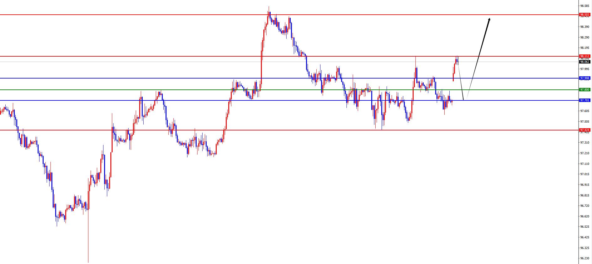 De un análisis de ciclo múltiple, el nivel semanal ha sido recientemente la consolidación clave de la línea semanal. Actualmente, la línea semanal admite el área 97.90. Continuamos prestando atención a la línea semanal que se cierre por encima de esta posición. Una vez que el mercado se cierra por encima de esta posición, haremos un fuerte aumento en el futuro. Desde el nivel diario, a medida que pasa el tiempo, la línea diaria se admite actualmente en el área 97.70, y la banda por encima de esta posición del precio ha aumentado aún más. Desde una perspectiva de cuatro horas, el precio estaba bajo presión en la posición de resistencia de cuatro horas a principios de la semana pasada, y el precio estalló y aumentó el jueves pasado, y luego volvió a la línea diaria y el apoyo de cuatro horas el viernes. El soporte general de cuatro horas se encuentra actualmente en la posición 97.80. Una hora más tarde, el mercado abrió más de las primeras operaciones de hoy, y los Bulls continuaron continuando después de que el precio llena el vacío.