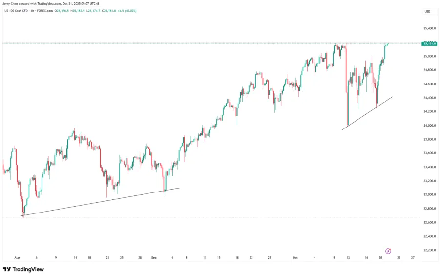 Después de un ajuste volátil en las últimas dos semanas, el índice Nasdaq 100 formó un patrón envolvente alcista semanalmente gráfico, y cerró de nuevo al máximo histórico de 25.200 nuevamente el lunes.