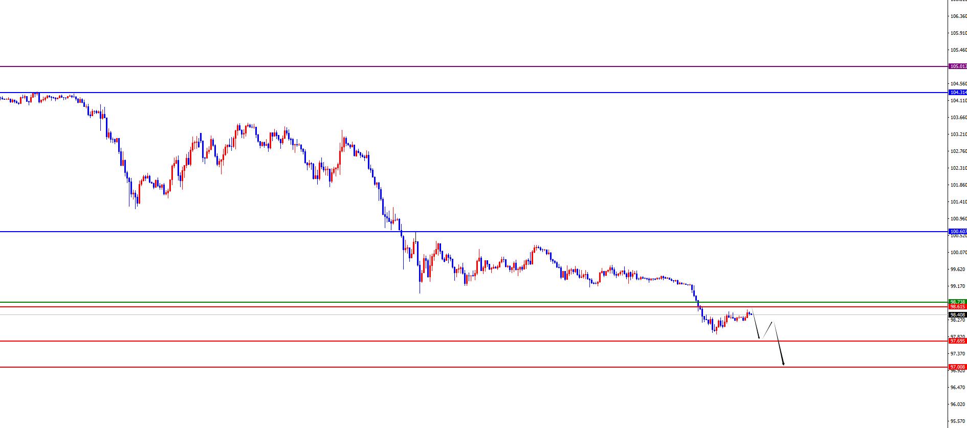 D'après une analyse multi-cycle, le prix est supprimé dans la résistance de la zone 105 au niveau hebdomadaire, donc dans une perspective à moyen terme, la tendance de l'indice du dollar américain sera plus baissière. Le dimancheAu niveau de la ligne, le prix est supprimé au niveau de résistance de la zone des 100,60, de sorte que la position courte est basée sur la pensée du groupe. La zone 98,60-70 à court terme est un bassin versant à court terme par l'indice américain, donc le prix à court terme est toujours baissier. Sur la base de la vue multi-cycle, le prix est inférieur à la résistance à plusieurs cycles, et le marché continuera d'être traité à une haute altitude à l'avenir. À court terme, nous prêterons temporairement attention à la pression dans la zone 98,60-70 et suivrons le soutien dans la zone 97,70-97 ci-dessous.