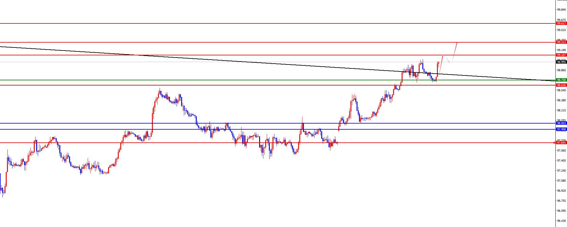 Dal punto di vista dell'analisi multiciclo, a livello settimanale, il prezzo si è recentemente consolidato su e giù lungo la linea settimanale chiave. L'attuale supporto settimanale è nell'area 97,90. Continueremo a prestare attenzione al prezzo che chiude al di sopra di questa posizione su base settimanale. Una volta chiusa al di sopra di questa posizione, la linea mediana si alzerà successivamente. Dal livello giornaliero, col passare del tempo, l'attuale supporto giornaliero è nell'area 98, e la fascia di prezzo al di sopra di questa posizione aumenterà ulteriormente. Da una prospettiva di quattro ore, all'inizio della scorsa settimana il prezzo era sotto pressione al livello di resistenza di quattro ore. Il prezzo ha sfondato ed è aumentato giovedì scorso, per poi tornare sulla linea giornaliera e sul supporto di quattro ore venerdì. Il supporto xn--xm-6d1dw86k.complessivo a quattro ore è attualmente a 98,60-70 e il prezzo rimarrà molto al di sopra di questa posizione nel breve termine. Ogni ora, il prezzo ha oscillato vicino alla linea di tendenza evidenziata ieri. Al momento, il breve termine è ancora rialzista, quindi per il momento rimarrà lungo finché il supporto a quattro ore non scenderà al di sotto. Solo dopo che si sarà rotto al di sotto il divario sarà coperto. Per il momento, posso trattarlo xn--xm-6d1dw86k.come un metodo di trading sul lato destro.