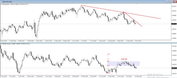 L'immagine sopra è un grafico sovrapposto della linea giornaliera NZDUSD (superiore) e della linea settimanale (inferiore). Il livello giornaliero mostra uno schema di caduta delle onde. Dopo ogni ciclo di onde cadenti, ci sarà una banda di rimbalzo relativamente significativa. Anche se la tendenza a medio termine è breve, il trading a breve termine in NZD/USD non è fluido a causa delle frequenti bande di rimbalzo ed è necessario essere sempre vigili se il mercato tocca il fondo.
