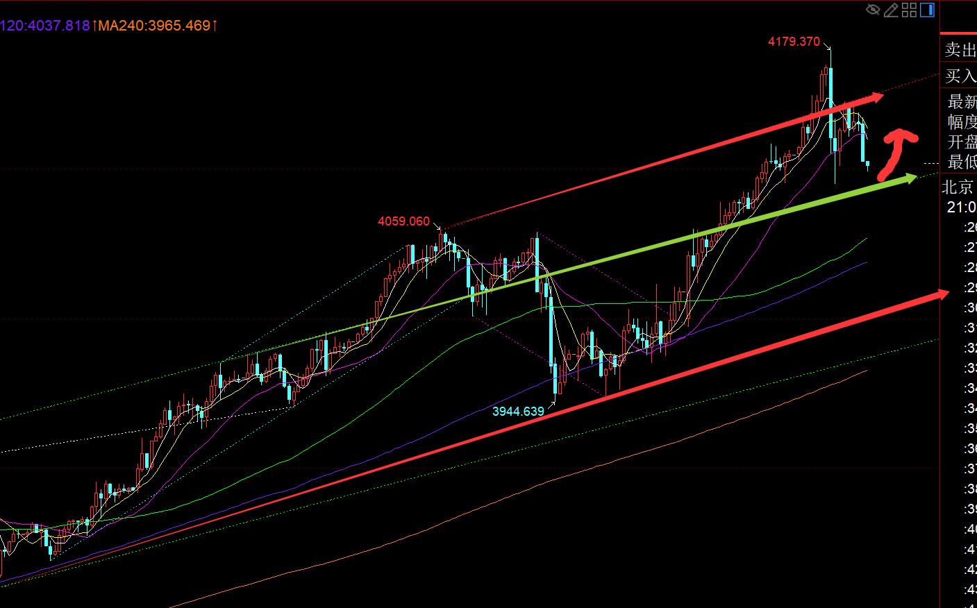 Secondo, il livello della linea dell'ora d'oro: nel pomeriggio, la linea 4179 è scesa a 4090, che è stato anche il punto più basso ieri sera. Dopo che il doppio minimo si è stabilizzato, il mercato europeo è rimbalzato a 4145, testando la resistenza al ribasso divisa in 618, anch'essa rossa nel grafico. Il punto di contropressione del canale; e il mercato europeo originario credeva che il rimbalzo fosse tornato a metà percorso, e l'intero mercato europeo si stava riprendendo e non ha continuato a indebolirsi nel pomeriggio, quindi la situazione generale è ancora piuttosto forte, e c'è una probabilità di sfondare la resistenza di 4045, e quindi sopprimere il massimo intraday e poi salire più in alto e scendere, simile al Movimento 1 del 9 ottobre; alla fine, il trend attuale non è stato così, ma ha deciso di sopprimerlo nuovamente, scendendo al di sotto del percorso centrale, e scendendo a 4100; quindi ciò che Bollinger ha portato via ora è stato ridursi e consolidarsi, la linea di supporto inferiore di 4090 è più critica, la resistenza della traccia centrale superiore di 4124 e il canale rosso Il punto di contropressione è 4150, quindi presta attenzione a finire nell'intervallo 4090-4150; personalmente, non penso che scenderà al di sotto del minimo intraday e testerà direttamente la media mobile giornaliera di 5 giorni. Se è così, aspetta solo che il mercato asiatico si stabilizzi domani e trovi un minimo per diventare rialzista;