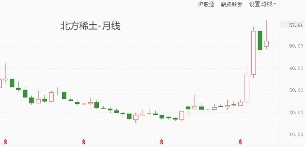 L'immagine sopra mostra una società rappresentativa che produce terre rare nel mercato delle azioni A: Northern Rare Earth. Nei mesi di luglio e agosto di quest'anno, il prezzo delle sue azioni è aumentato rispettivamente del 50,6% e del 51,49%. Questo mese ha raggiunto 61,69 yuan, avvicinandosi al massimo storico di 62,1 yuan. È proprio a causa dell'estrema dipendenza degli Stati Uniti dalle terre rare che il settore delle terre rare nel mercato delle azioni A è diventato sempre più popolare sul mercato.