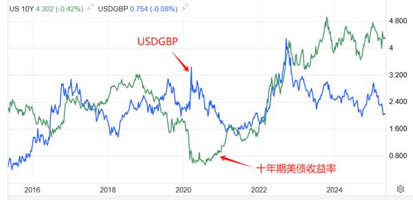 위의 차트는 영국 은행 벤치 마크 이자율, 영국 10 년의 재산 수익률 및 GBPUSD의 일일 추세 차트의 오버레이입니다. 영국 은행은 벤치 마크 이자율과 영국 10 년 재무 수익률은 긴 주기로 상당한 공명을 보이지만 중기 및 단기적으로는 가끔 분기됩니다. 예를 들어, 2024 년 9 월 이후 영국 은행은 금리 인하 추세를 유지했지만 10 년간의 영국 채권 수익률은 계속 증가했습니다. GBPUSD의 추세는 또한 10 년의 영국 채권 수확량과의 공명 특성을 가지고 있지만,이 공명은 어느 때에 손상 될 것입니다. 예를 들어, 2021 년 8 월부터 2022 년 9 월까지 10 년 영국 채권에 대한 수익률은 계속 증가했으며 GBPUSD는 계속 하락했고 두 사람은 크게 분기되었습니다.
