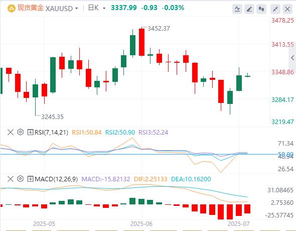 Rang undang -undang pemotongan cukai Trump menyalakan ledakan keengganan risiko, dan jangkaan Rizab Persekutuan terhadap pemotongan kadar faedah telah dipanaskan lagi. Pasaran emas mengalir dalam pusingan baru ke atas pada awal bulan Julai 2025. Harga emas tempat melonjak lebih daripada 1% pada hari Selasa, memukul tahap tertinggi sejak 24 Jun pada $ 3,357.82/auns, ditutup pada $ 3,338.77/auns, naik dua hari perdagangan berturut -turut.