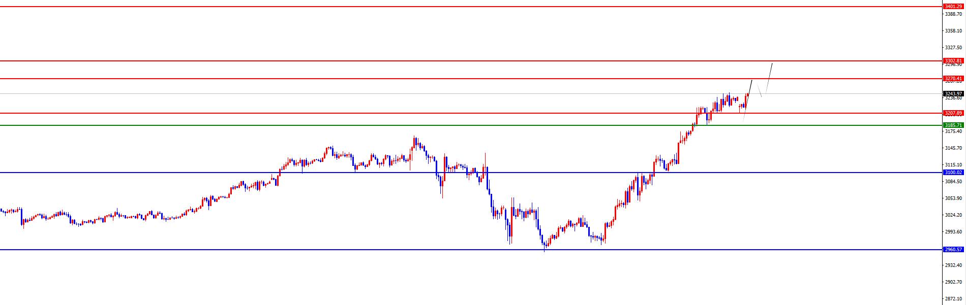 Jumaat, dengan harga tertinggi meningkat kepada 3245.18 pada hari itu, jatuh ke 3176.01 pada harga terendah, dan ditutup pada 3237.74 pada hari itu. Sebagai tindak balas kepada trend jangka pendek harga semasa sesi dagangan awal Jumaat lepas, pasaran Eropah dan AS menunjukkan irama menaik yang tidak menentu. Akhirnya, keadaan positif yang besar dari harga dalam talian pada hari yang sama dan mingguan berakhir. Secara keseluruhannya, masih ada ruang untuk emas meningkat pada masa akan datang. Dari perspektif analisis teknikal, trend Gold pada awal minggu lalu agak terkawal, dan harga telah berjalan di bawah kedudukan rintangan yang ditunjukkan dalam carta empat jam. Walau bagaimanapun, pada hari Rabu, harga emas menunjukkan kuasa terobosan yang kuat, bukan sahaja berjaya melepasi tahap rintangan empat jam, tetapi juga melangkah ke tahap rintangan harian. Kejayaan ini telah membawa kepada trend jangka pendek dan band ke atas, dan pada akhir minggu, harga emas terus meningkat dan kenaikannya pesat.
