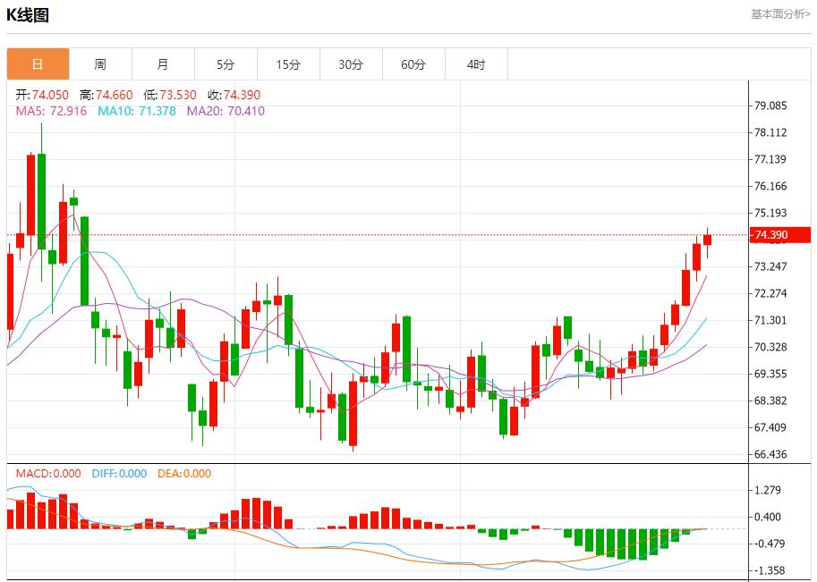 原油市场:截止北京时间21:25,美油上涨,现报74.390,涨幅0.58%。纽市盘前,原油价格目前正在测试关键支撑位73.70美元,价格需要在该水平上方盘整,以保证今天预期的牛市趋势的延续,因为突破该水平将推动价格遭受日内损失,达到72.15美元,而预期牛市的下一个主要目标位于75.65美元。