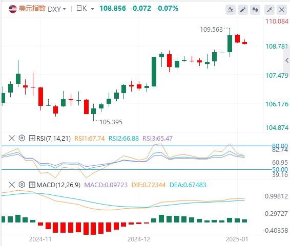 上周五,美元指数持续下行,最终收跌0.31%,报108.92,但因市场预期美国经济今年的表现将继续优于其他主要经济体,且美国利率将保持相对较高水平,美元指数仍创近三周来最强劲的周度表现。截至目前,美元报价108.85。
