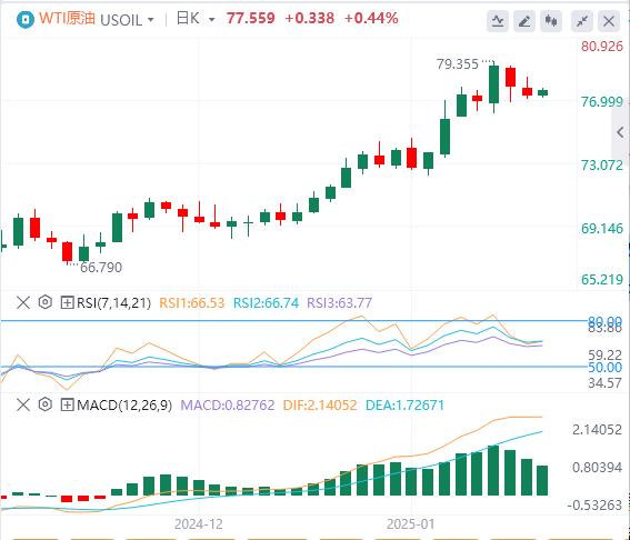 周一亚盘,原油交投77.55附近。在供应收紧和强劲的季节性需求的推动下,原油价格上周收盘强劲上涨。美国对俄罗斯石油生产商和油轮的制裁严重扰乱了全球航运路线,减少了可用供应并提振了市场情绪。与此同时,美国和欧洲的天气比预期更冷,增加了对取暖油的需求,增加了看涨的基调。