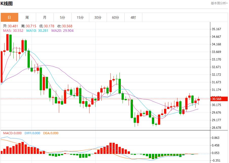 现货白银:截止北京时间21:20,现货白银上涨,现报30.580,涨幅0.39%。纽市盘前,白银价格现在显示出一些看跌倾向,受随机利空的影响,而EMA50为价格提供了积极的支持,等待突破30.63美元以确认向31.30美元反弹,随后是31.63美元作为下一个主要目标,注意到继续下跌和突破30.25美元将阻止熊市波,并推动价格在当天剩余时间内转为下跌。