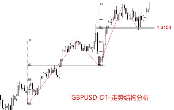 创新高是比较极端的行情表现,非常考验市场信心的稳定性。前期高点1.3443虽然被突破,但如果今日收盘时长上影线依旧存在,形成比较危险的顶部结构。如果上影线较小,并且后续两个交易日以长阳线上涨,则市场信心稳定,多头趋势大概率延续。走势结构角度看,日线级别,前一轮回调走势在0.382黄金分割为触底反弹,结构健康,涨势延续的概率较高。