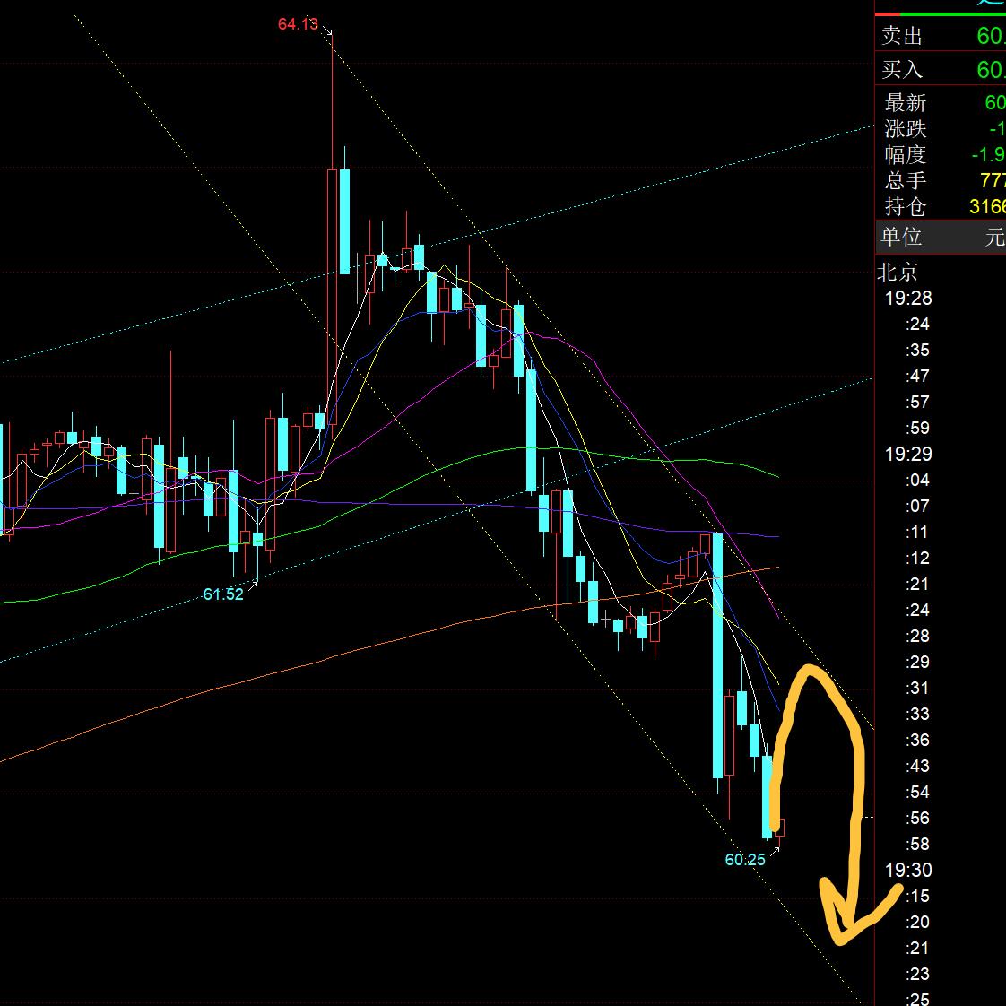 原油方面:前几日的上行通道失守,当前处于下跌通道,今晚留意上轨,也是小时线中轨61.3之下看压制回落,支撑60;