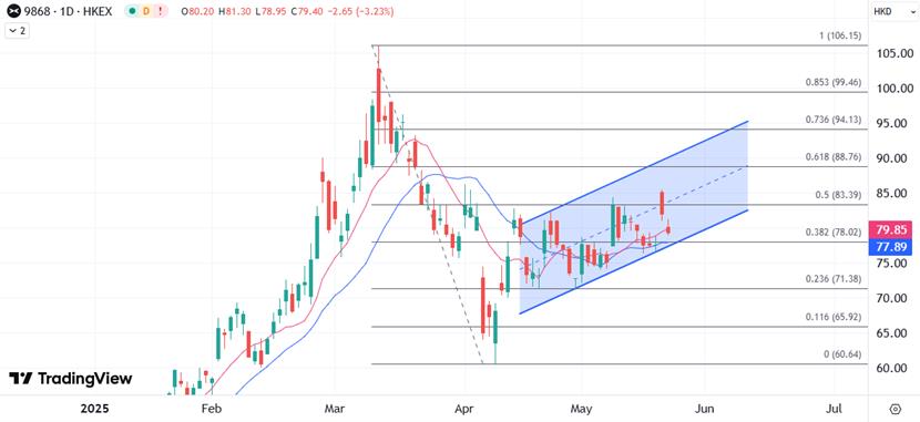 在业绩交出利好的答卷后,接下来股价继续聚焦新车型交付、月度销量数据超预期、智能驾驶技术突破等因素,整体港股市场以及新能源汽车行业情绪的回暖有望带来积极的氛围,中长期来看,股价取决于技术变现能力和毛利率改善。小鹏股价昨日大涨后今日调整,显示市场在股价达到4月初以来后部分结利,技术上也在85港元上方遇阻,需要看日图均线能否帮助捍卫78港元,配合通道底部带来支撑后重启反弹,否则可能延续调整指向更有力的支撑在71港元附近。