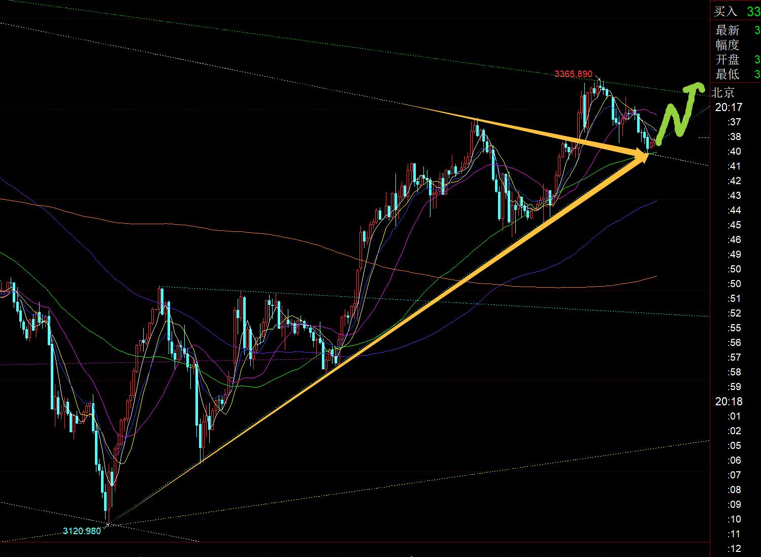 第四,黄金小时线级别:今日亚盘和欧盘都是一路震荡回落,美盘可能存在二次打压,但欧盘低点3323位置已经触及了上图关键趋势线支撑,且临近3322上周五欧盘横盘低位,也是3279-3366的50%分割支撑,又是66日均线支撑;所以3322之上已经存在多处共振,今晚比较关键的节点支撑;一方面存在二次打压可能,另一方面又存在随时企稳拉升可能,当前有所陷入矛盾;但有一个走势可以完美诠释,把这两种情况都包含进去:亚欧盘偏弱,美盘前后先出现一波拉升去试探中轨3345,然后承压中轨进行二次压制,但二次下滑依然不破3322,后半夜再企稳上攻,这种走法是最理想的;或者是美盘后二次打压,也是守住3322之上,再探底拉升上攻;