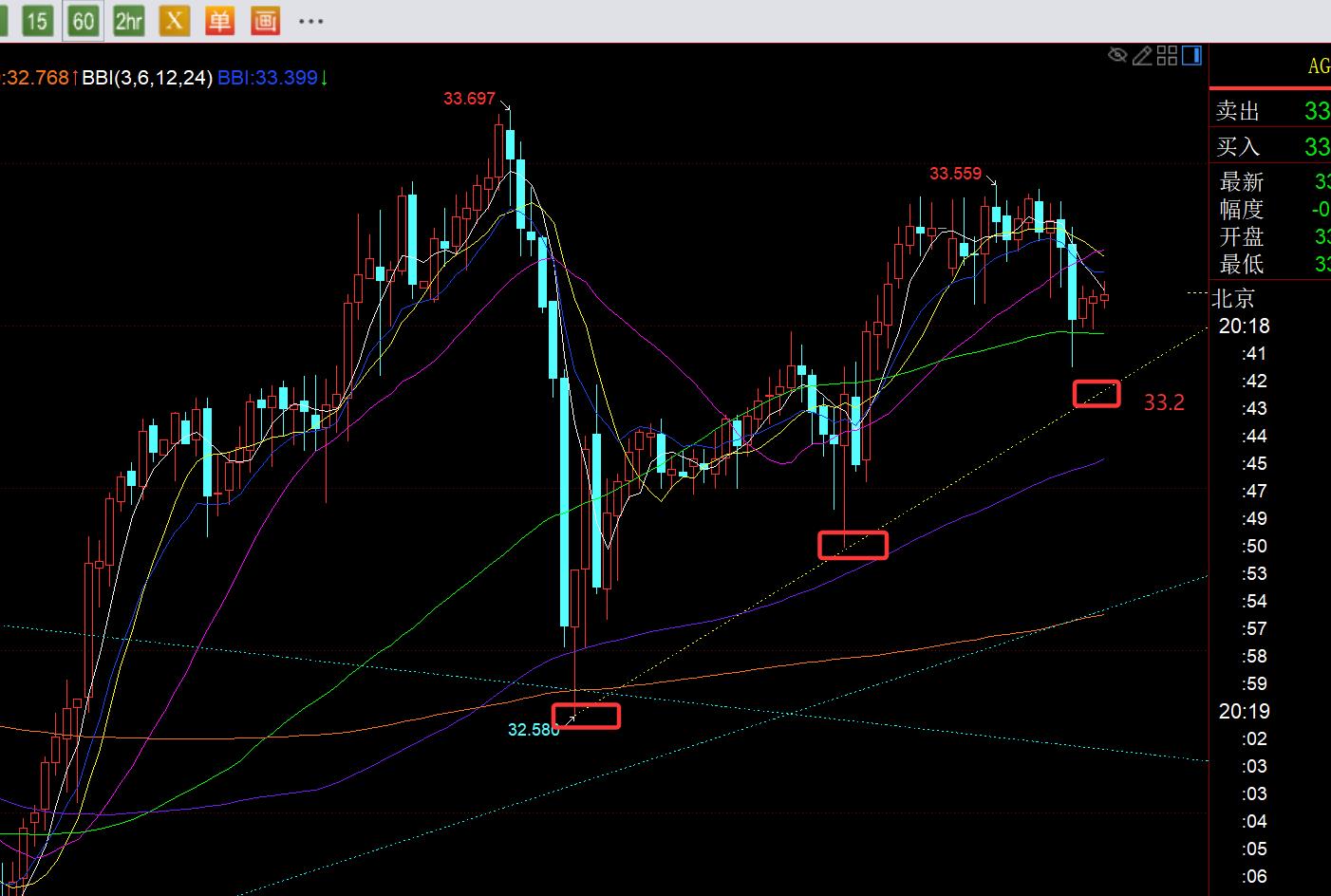 第二,白银方面:整体也是震荡慢上涨,最高触及33.5一线;