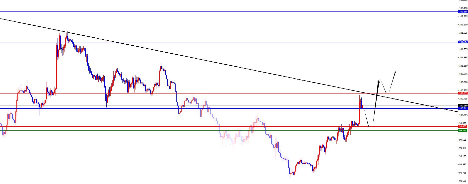 从多周期分析,周线级别来看价格压制在101.70区域阻力,那么从中期视角出发,美元指数的走势将更偏向于空头。在日线级别上随着时间的推移价格关键阻力位置于100.20位置,今日早盘价格向上刺破此位置,后续需要关注日线收盘表现,只有日线收盘在此位置上方才属于实际站稳,所以今日是行情能否站稳的确定日。同时按照四小时级别看,随着时间的推移周二价格突破四小时阻力位置,则短线价格偏多,随着时间的推移暂时需要关注99.70-99.80区间支撑,所以暂时先关注此位置支撑看上涨,后续重点关注日线阻力能否站稳是关键。同时按照一小时级别看上方100.50位置是关键趋势线阻力,所以后续需要关注日线阻力及趋势线阻力得失。