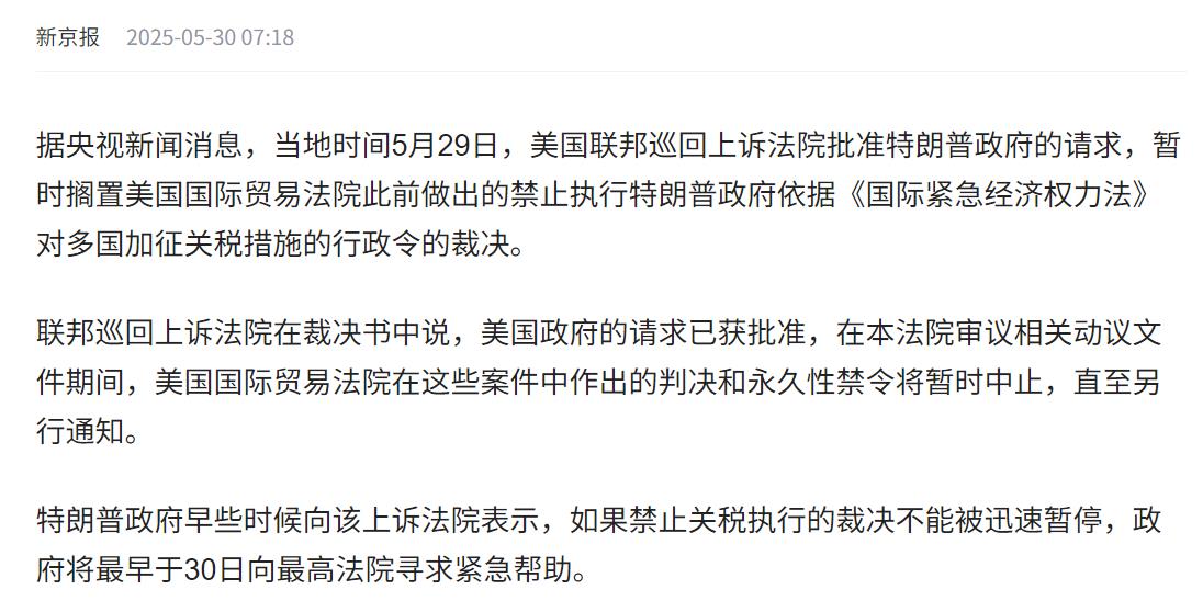 此前一天,美国国际贸易法院裁定暂停特朗普政府于4月2日宣布的一揽子加征关税政策生效。