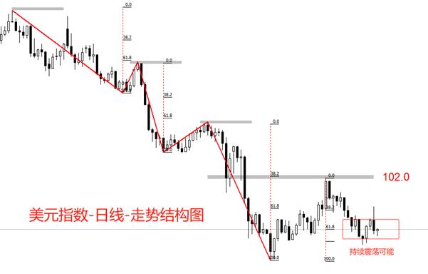 走势结构角度看,日线级别,美元指数处于显著空头趋势,但是,最近的一轮上涨和下跌波段呈现出筑底结构,未来可能出现中期趋势反转。最新市价运行于前一轮上涨波段的0.618黄金分割位附近,获得有效支撑概率较高。昨日,受消息面影响,美指日线形成长上影线,叠加5月26日的短实体长下影的K线,未来行情在此区域形成窄幅震荡区间的概率较高。