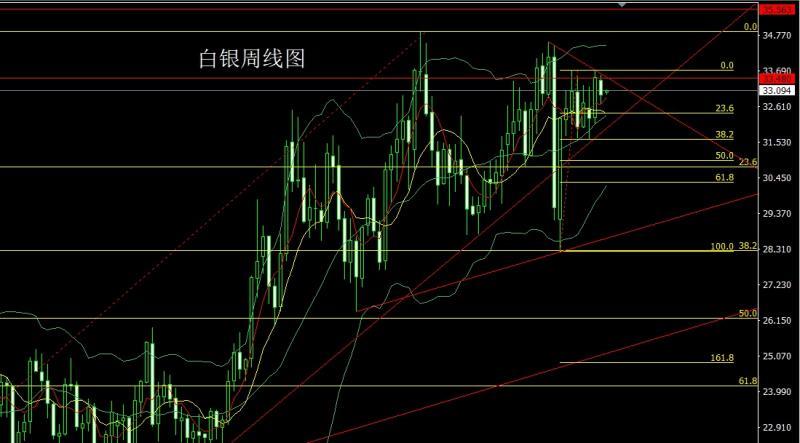 白银市场上周小幅低开在33.417的位置后行情先拉升回补缺口给出33.562的周线高点后行情强势震荡回落,周线最低给到了32.68的位置后行情大区间震荡,周线最终收线在了32.971的位置后行情以一根下影线稍长于上影线的中阴线收线,而这样的形态收尾后,本周33.3空止损33.45,下方目标看33和32.8.