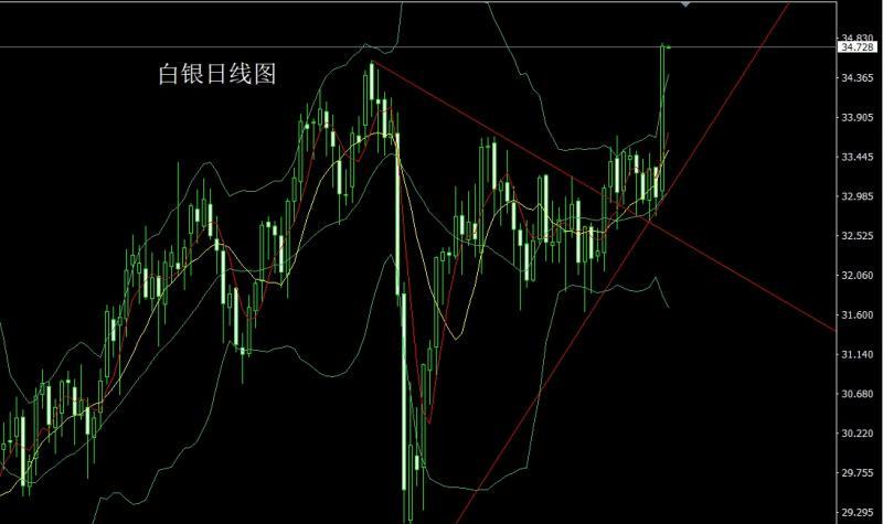 白银市场昨日早盘高开在33.048的位置后行情先回落,日线最低给到了32.937的位置后行情强势拉升,破位上周高点后行情加速上行,日线最高触及到了34.779的位置后行情整理,日线最终收线在了34.734的位置后行情以一根下影线较长的大阳线收线,而这样的形态收尾后,今日34.25多止损34,目标看34.6和34.8和35,破位的话上方看35.5和36和37.