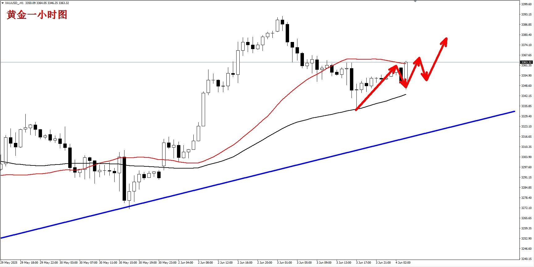早盘金价回踩最低到达3346一线,并且一小时走出了阳包阴的形态,也就是说上午多头的能量是比较强的,但是我还是建议大家不要追单,早盘急涨无好事,追涨容易套在高点,我们早盘只要留意两个点位就可以了,就是3330关键位和3346短线支撑位,盘中如有回踩到达3350附近开始埋伏做多!