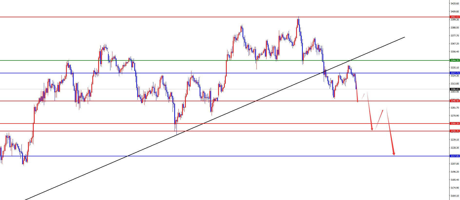 黄金昨日3330-3340区域空继续持有,目标3290-3250-3220