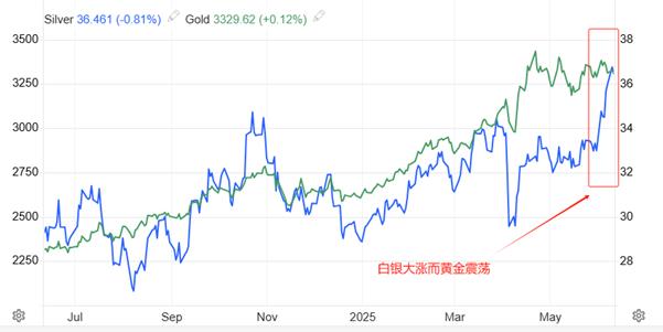 6月2日至今,COMEX白银价格持续大涨,市价从33.07美元涨至最高37.03美元,创出2012年3月份以来新高,累计涨幅11.97%。同期的黄金表现萎靡,市价从开盘时的3323至当前的3352,累计涨幅仅为0.87%。白银的涨幅是黄金的13倍,震惊市场。